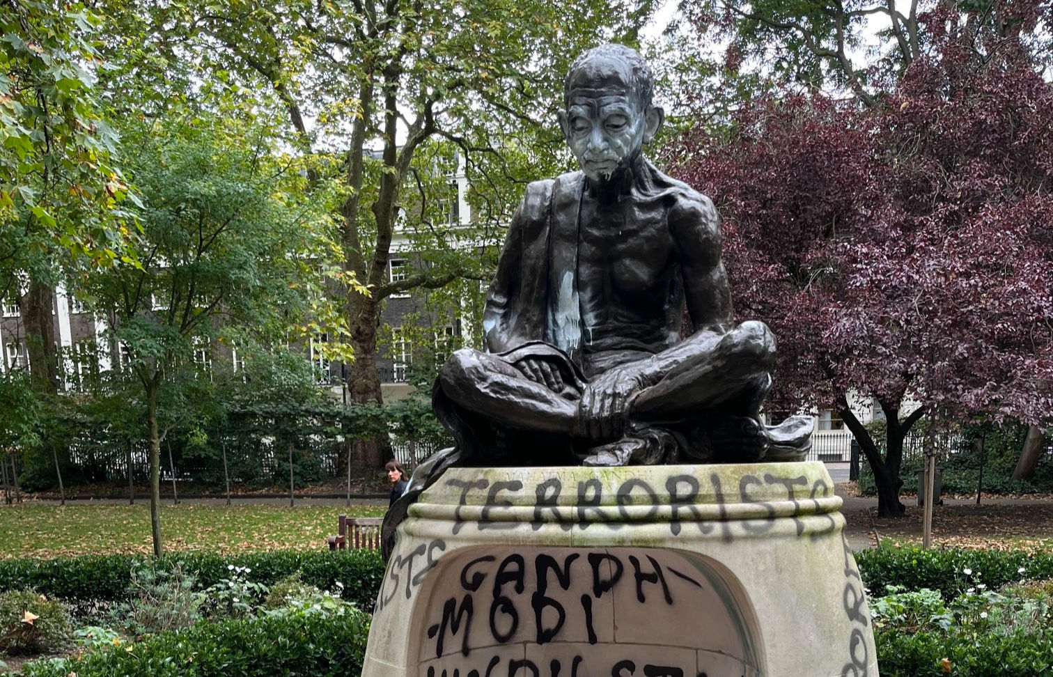 In a statement, the Indian High Commission in London described the act as “shameful” and “an attack on the global message of non-violence.”