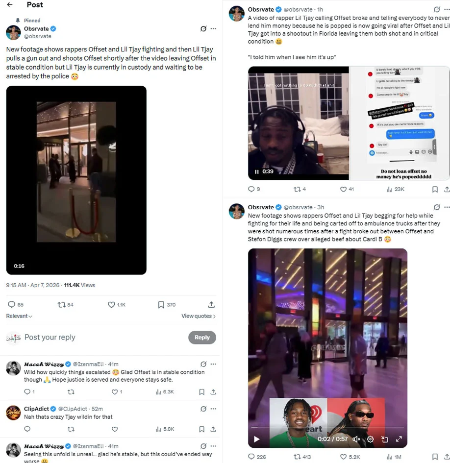 Social media quickly became flooded with speculation regarding the shooter. Some online posts, including one from the X account @obsrvate, allege that another rapper, Lil Tjay, was involved in a confrontation with Offset that escalated to gunfire. According to these claims, Lil Tjay allegedly fired the shots that hit Offset.